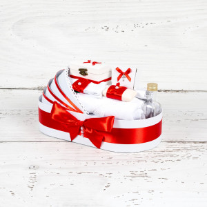 - cutiuta in forma de cufar pentru prima suvita. Micul cufar din lemn este decorat cu vopsea inofensiva pentru sanatate, data cu lac si decorata manual cu fundita si banda rosie. Dimensiuni cutie mot/turta: 9 cm x 5,5 cm x 5 cm (L x l x H).