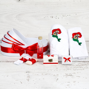 Acest trusou in landou cu decor rosu si model brodat Mica Sirena este o alegere excelenta pentru momentul in care o fetita va primi taina botezului. Piesele din trusou sunt ambalate intr-o cutie tip landou. Cu exceptia prosoapelor din set si a panzei de mir, celelalte accesorii, inclusiv landoul sunt decorate manual cu panglici si fundite de culoare rosie in Atelierul SelfEvents.ro.