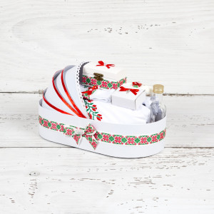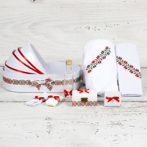 Unul dintre cele mai simpatice trusouri biserica in stil traditional pe care o nasa de fetita il poate achizitiona pentru botezul finei sale este trusoul cu model traditional rosu. Acesta are o broderie in stil etno pe panza de mir, dar si pe prosopul bebelusului, in timp ce paturica pentru copil si prosopul preotului sunt albe.