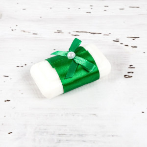 Piesele din trusou sunt ambalate intr-o cutie tip landou decorata manual cu banda satinata si funda verde.
