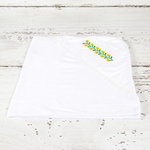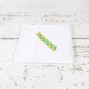 - Panza de mir pentru bebelus din bumbac alb cu capison. Panza are model traditional cu verde si galben. Dimensiuni: 100 x 100 cm. Aceasta este folosita dupa ce baietelul a primit taina botezului.