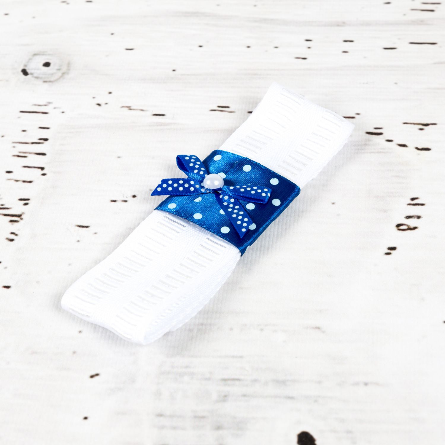 Cu exceptia prosoapelor din set si a panzei de mir, celelalte accesorii, inclusiv landoul sunt decorate manual cu panglici si fundite de culoare bleumarin cu buline in Atelierul SelfEvents.ro. Conform traditiei, cei care vor cumpara trusoul pentru biserica sunt nasii bebelusului.