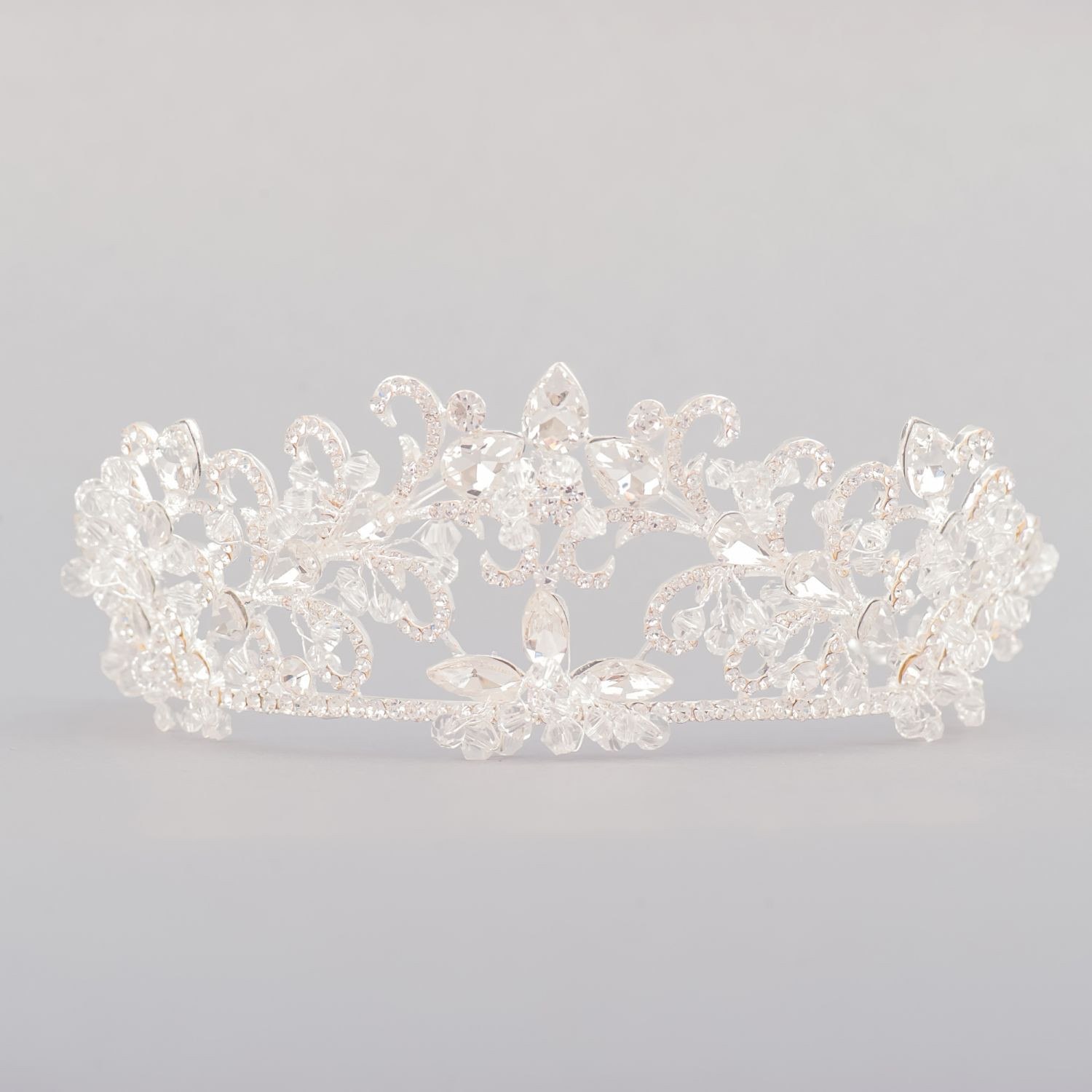 Tiara mireasa Francesca este realizata din metal inoxidabil, de culoare argintie si impodobita cu o multime de elemente glam, cum ar fi pietre strass, cristale si sticla.