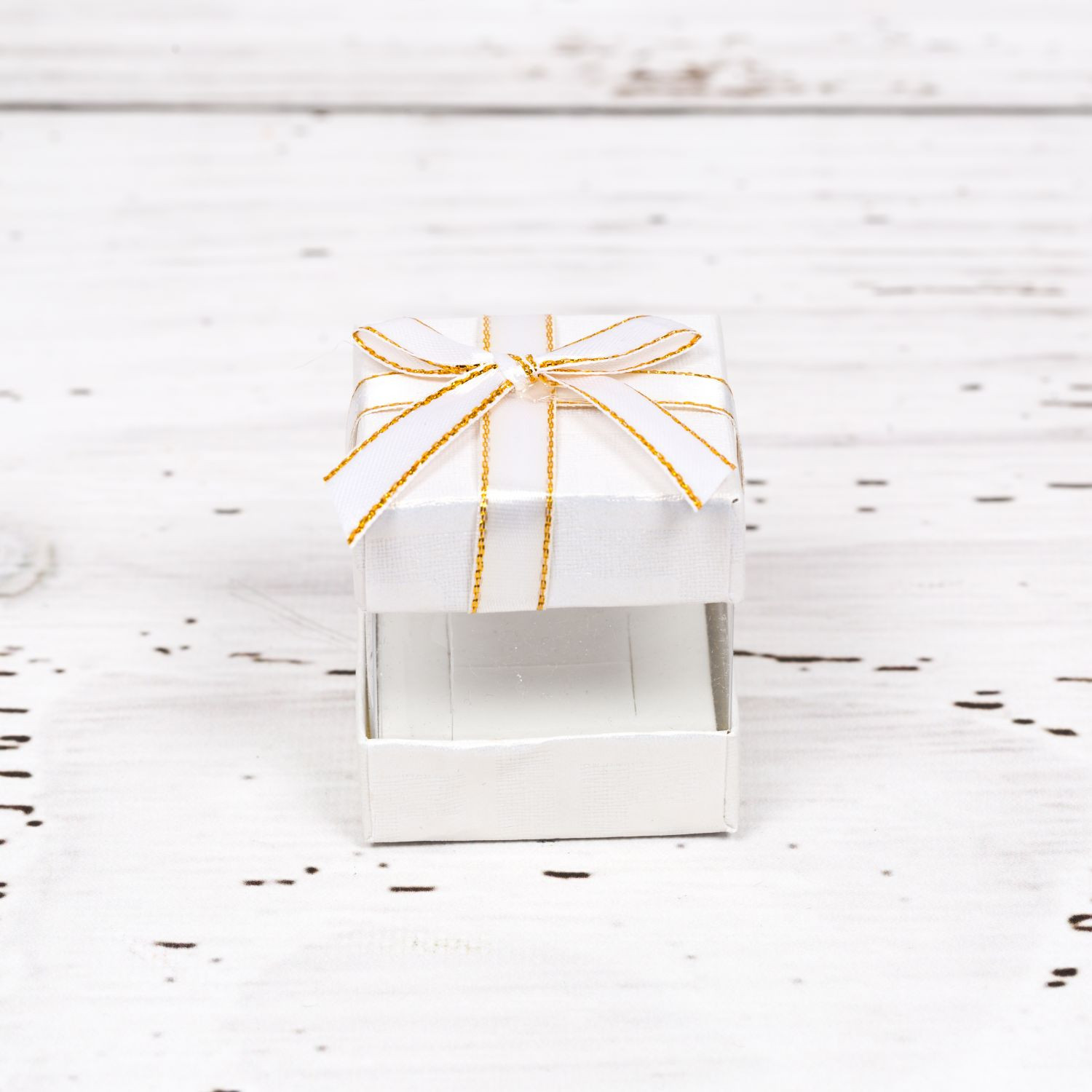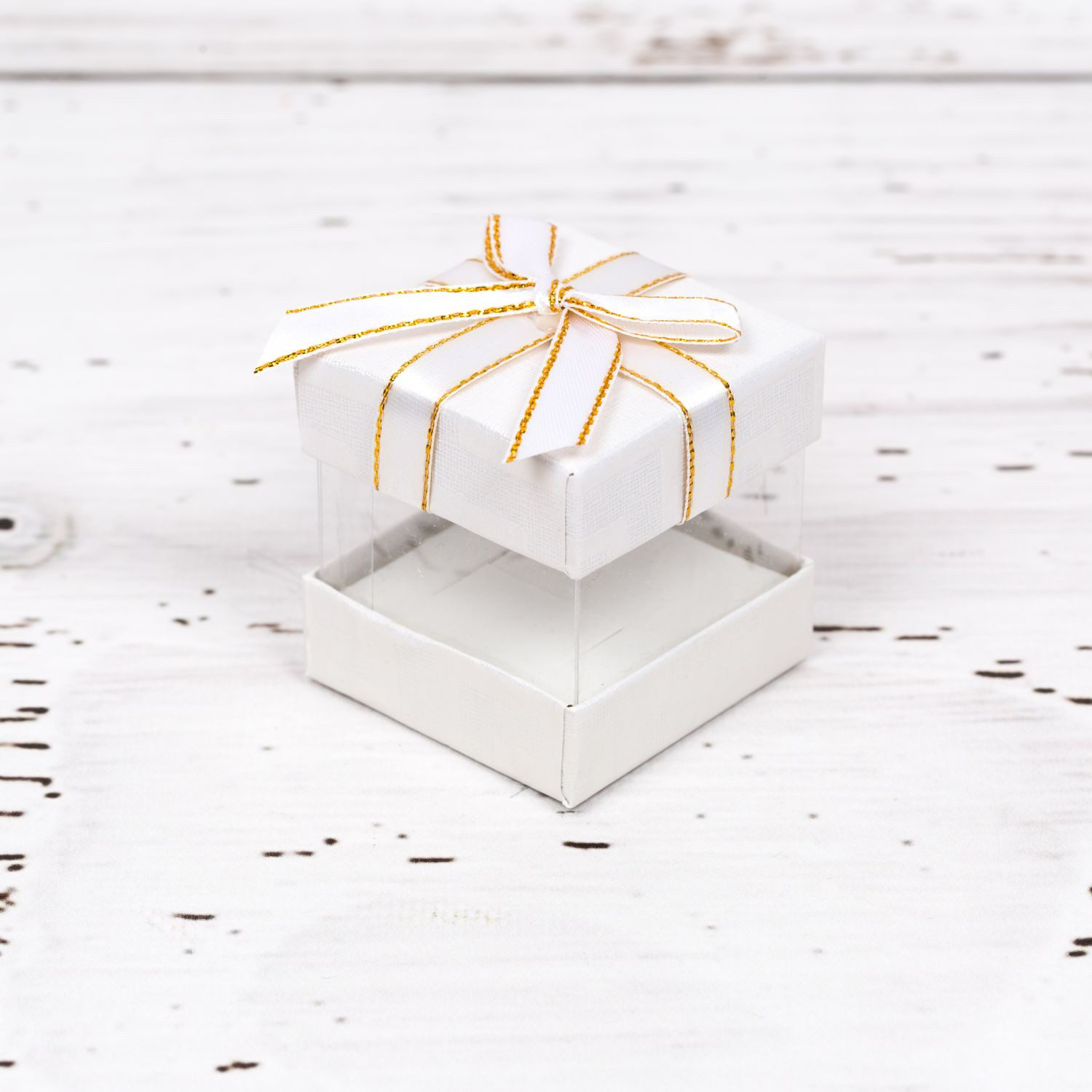 Cutiuta cadou din carton si plastic transparent, in nuante neutre, cu fundita aurie.