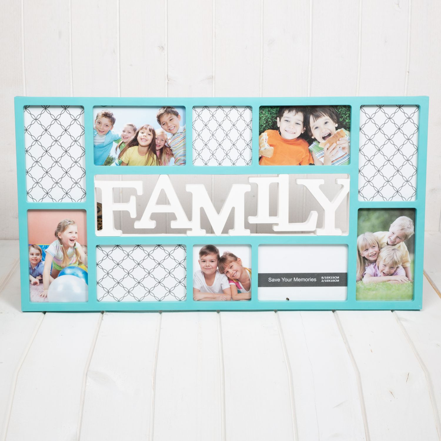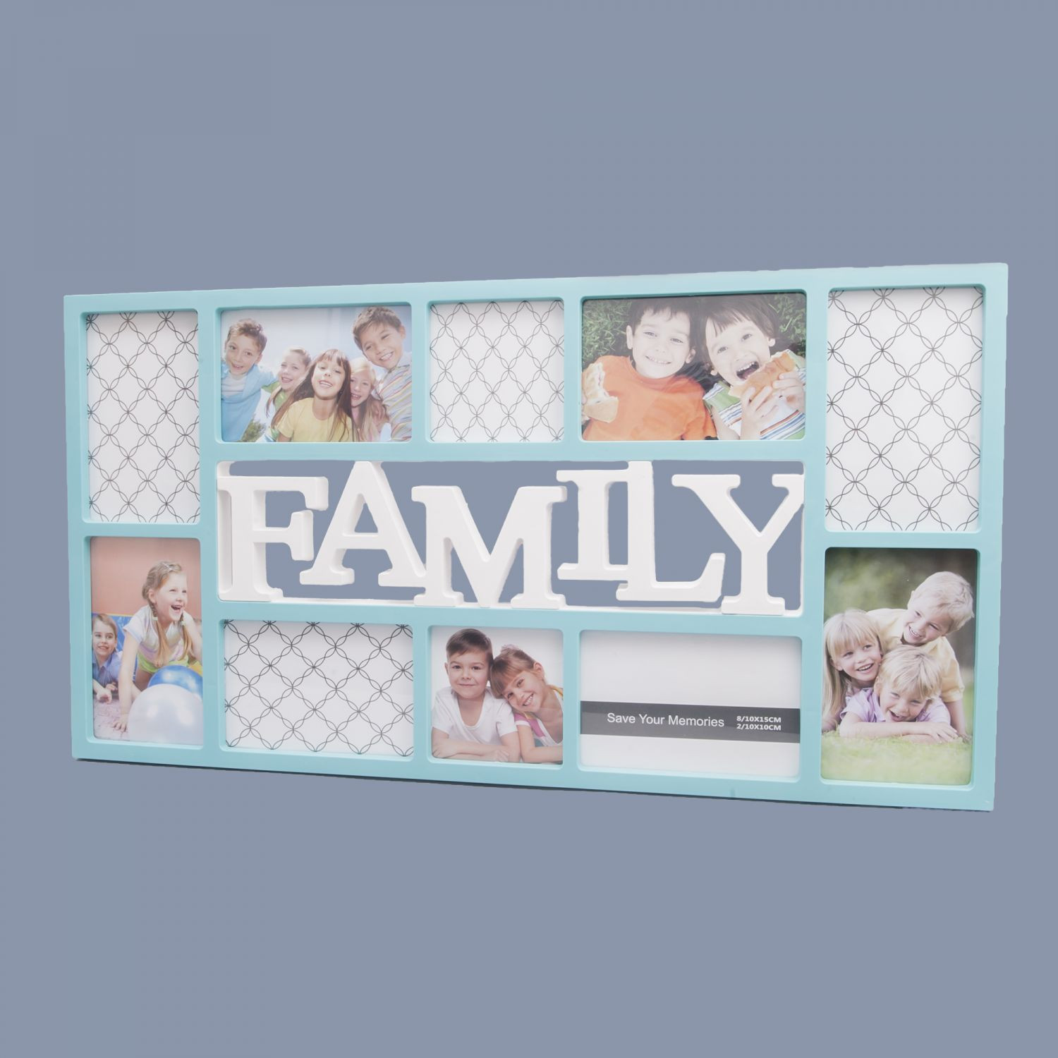 Rama foto Family bleu are 8 spatii pentru fotografii cu dimensiunea si 10 x 15 cm si doua spatii cu dimensiunea 10 x 10 cm.