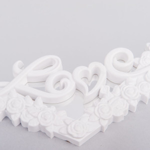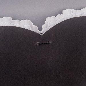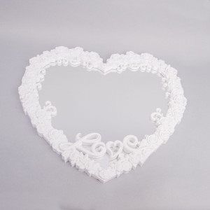 Oglinda de mireasa in forma de inima, inconjurata de un cadru alb din plastic, cu model trandafiri este un frumos obiect decorativ, ideal pentru nunta.