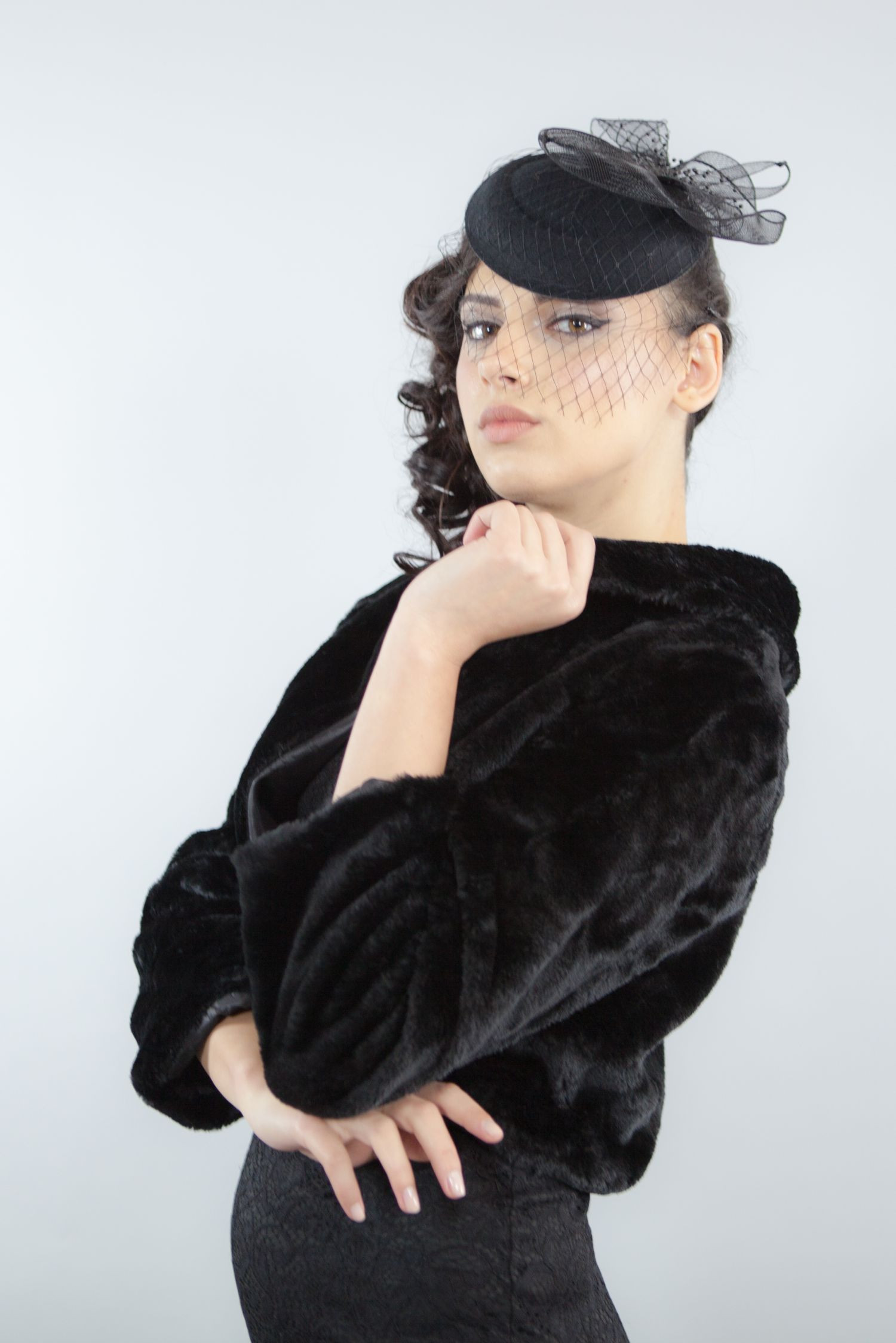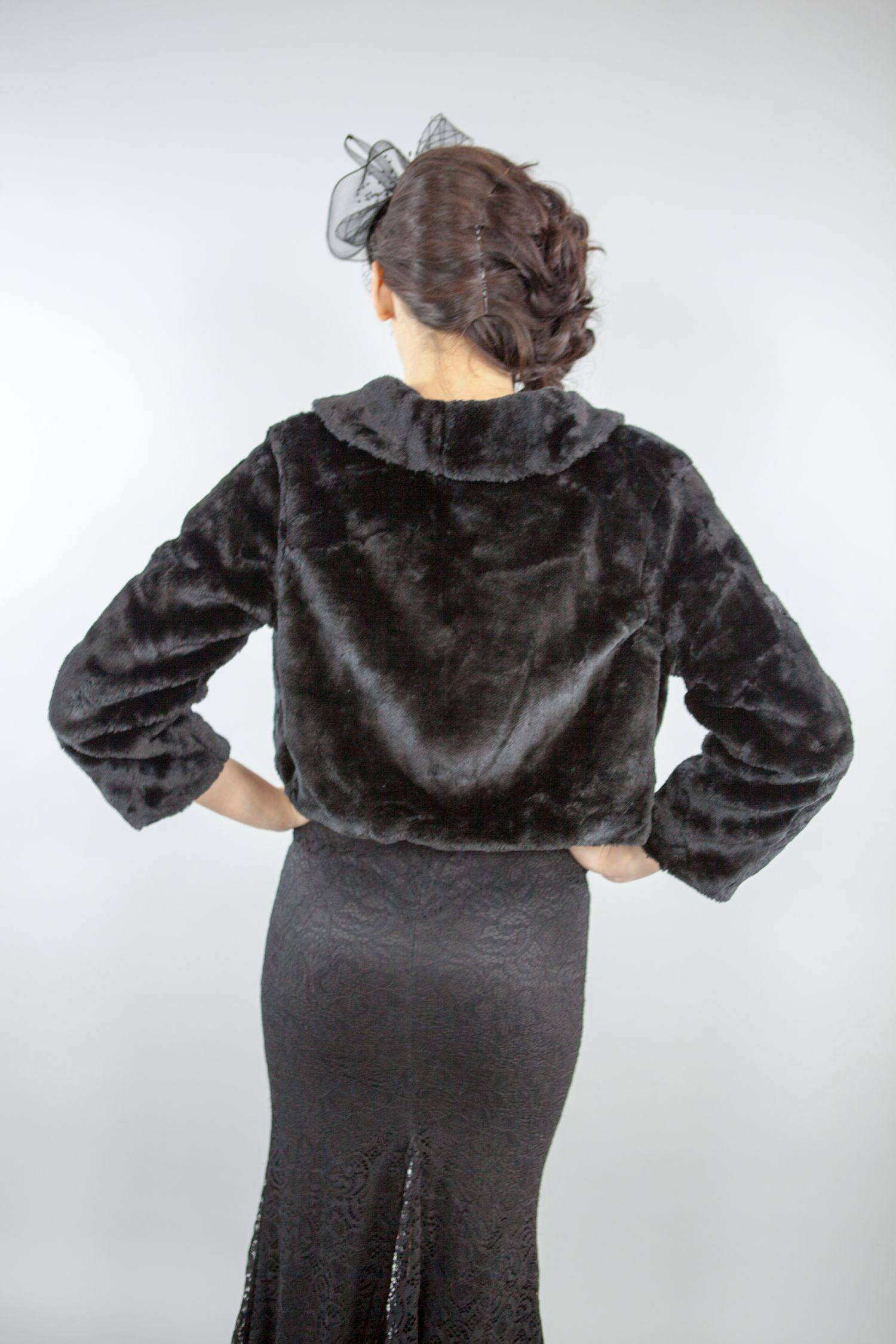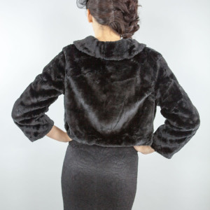 Capa de ocazie calduroasa si eleganta din blana artificiala de culoare neagra cu maneci trei sferturi.