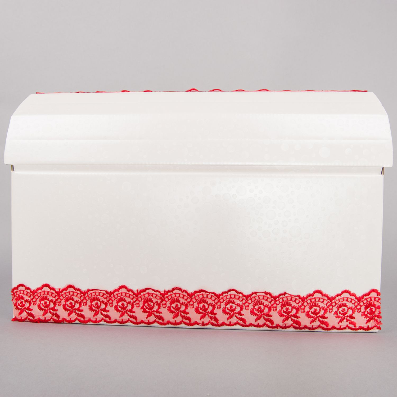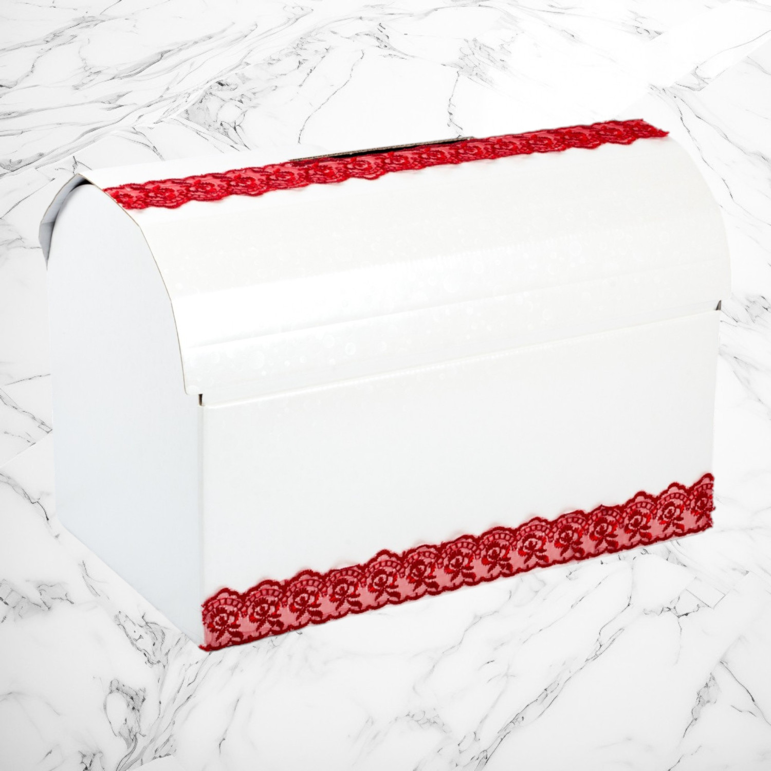 Casuta de dar cufar este decorata deasupra cu dantela rosie.