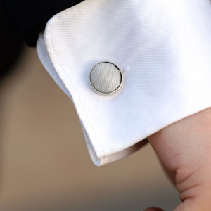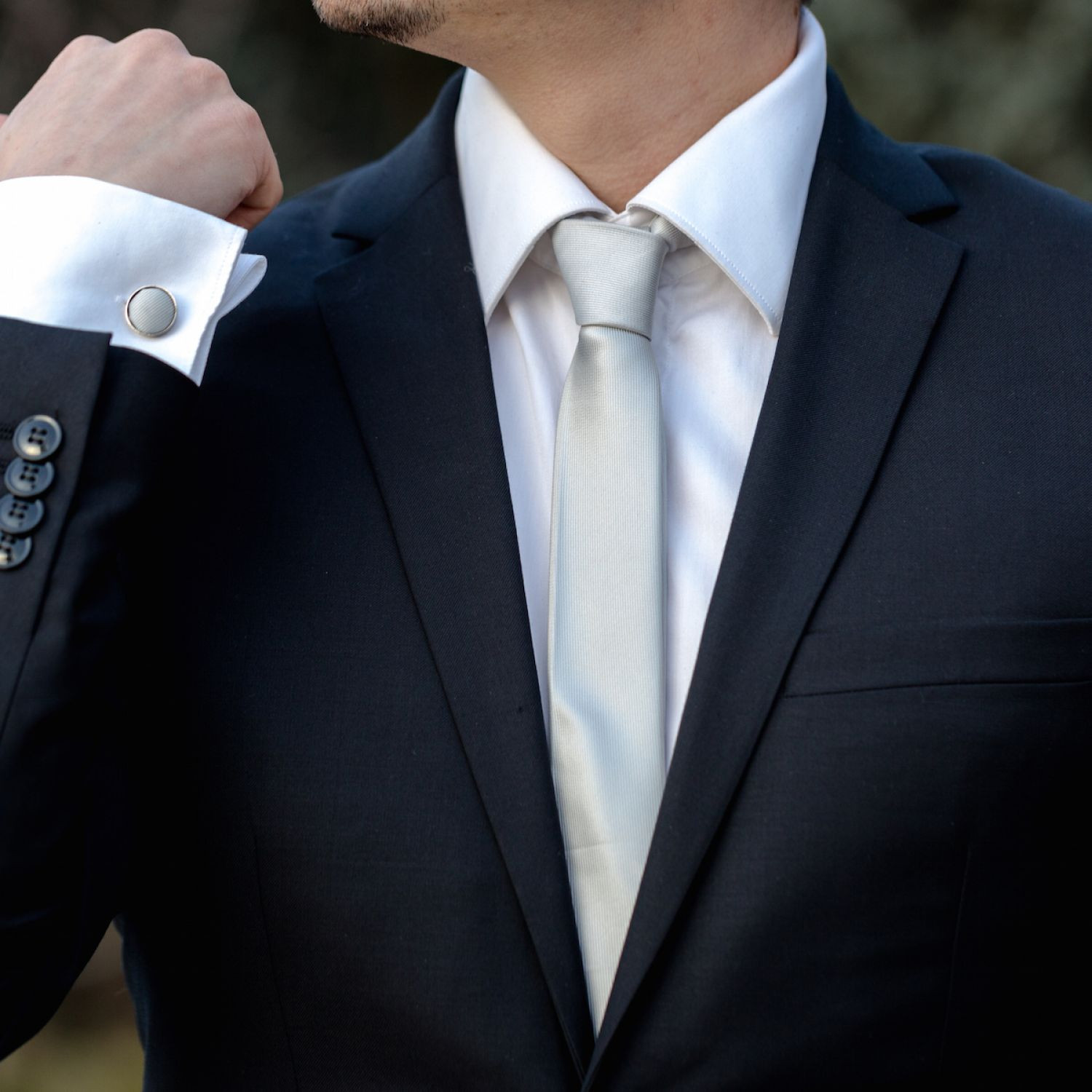 Iti recomandam o cravata slim de culoare gri, cu dungi verticale si niste butoni camasa realizati din material textil si otel inoxidabil.