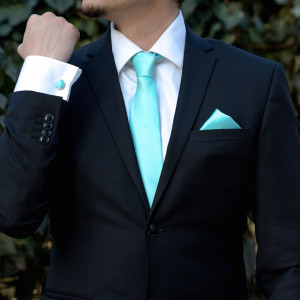 Daca nunta are o tenta usor casual, setul de accesorii cu cravata aquamarin este mult mai potrivit decat unul cu papion. Cravata si batista din poliester, alaturi de butonii de camasa in culori bleu-ciel iti vor oferi un look special in ziua nuntii.