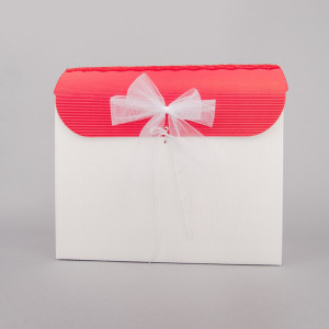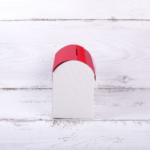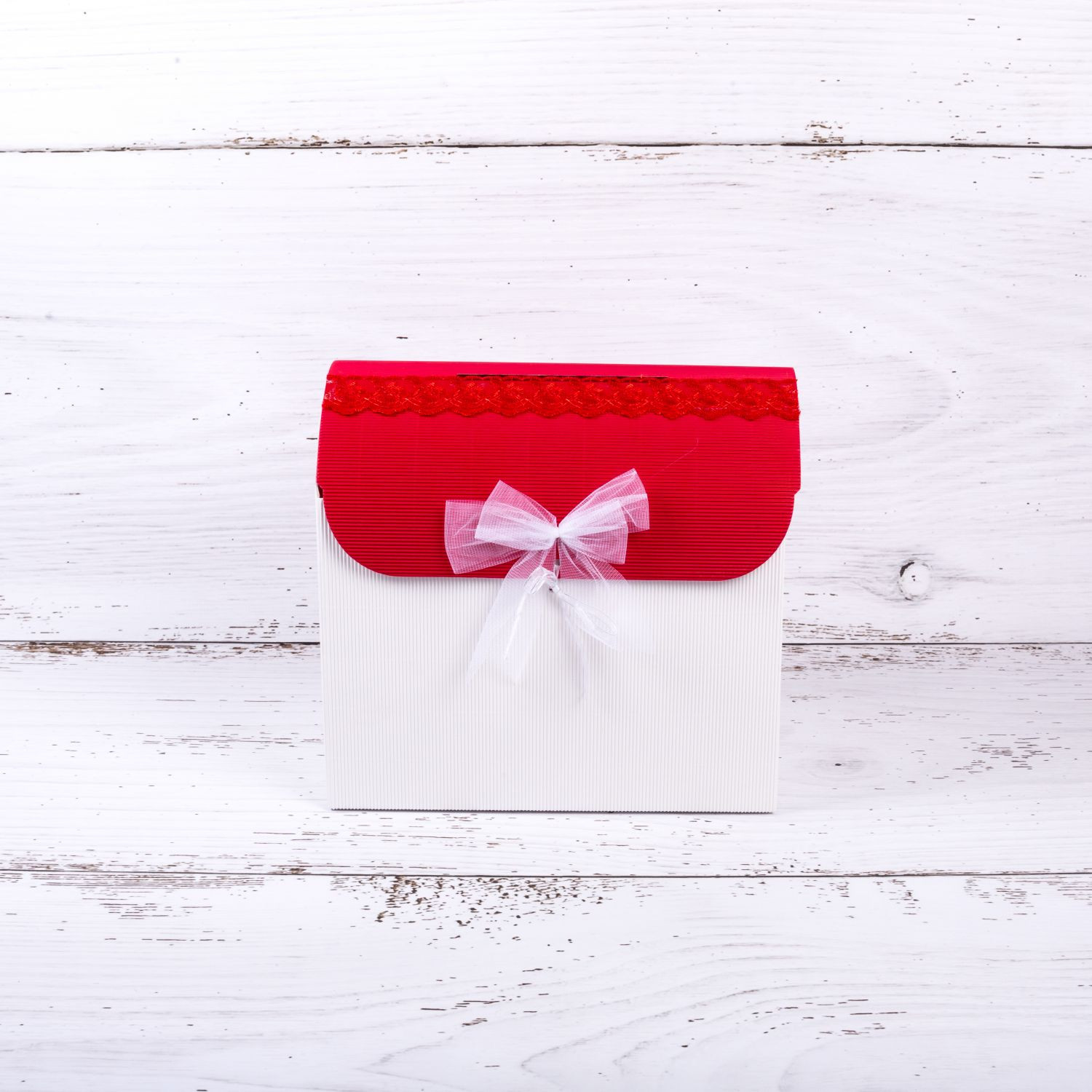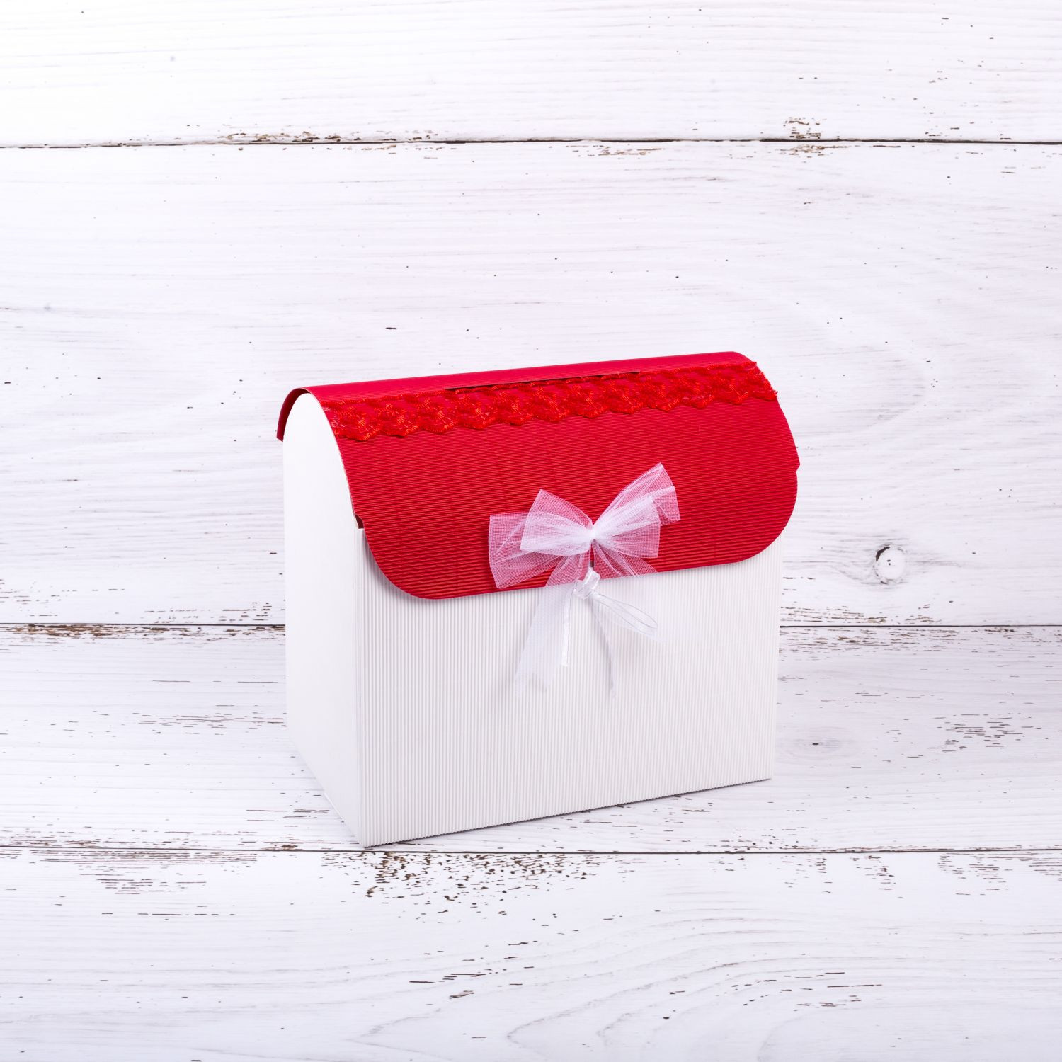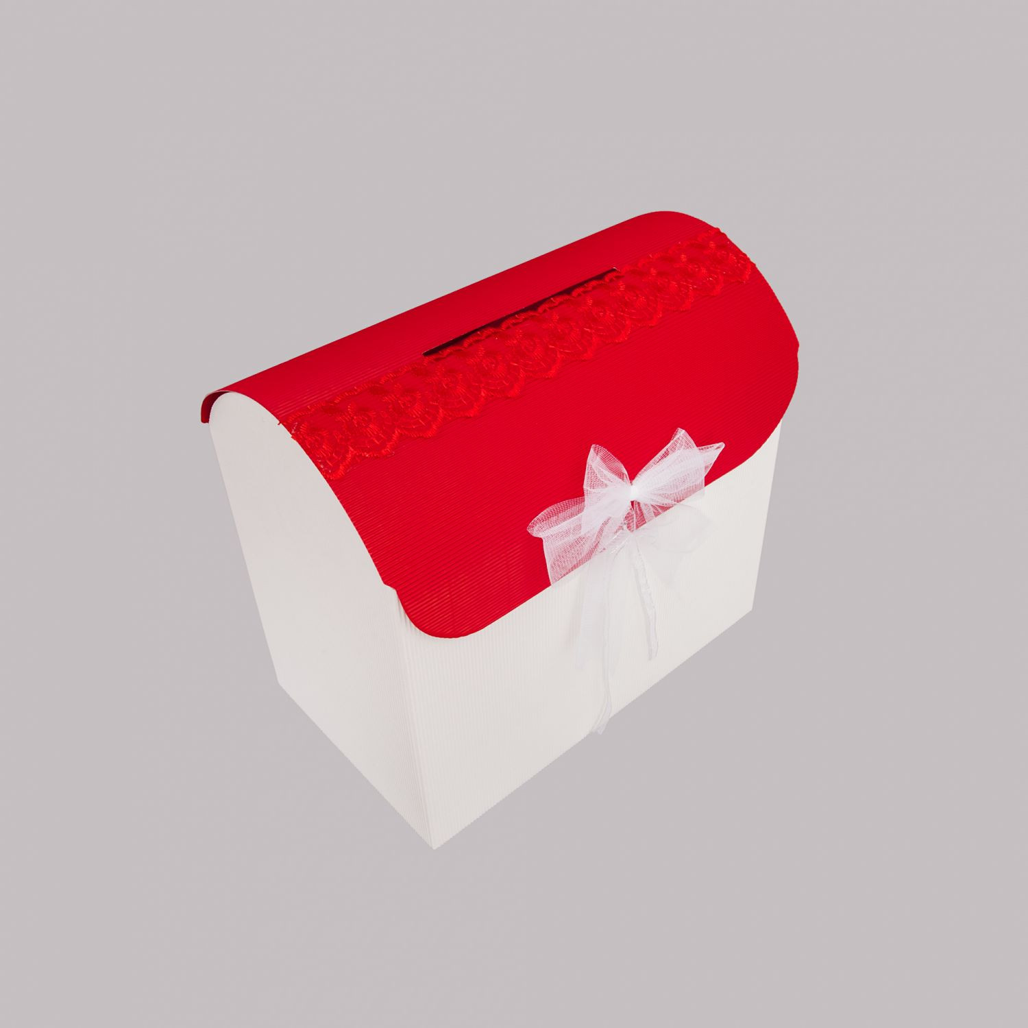 Acest cufar de dar realizat manual din carton ondulat are capacul rosu, iar la baza, pe cutie este lipita o banda din dantela de culoare rosie cu motive florale.