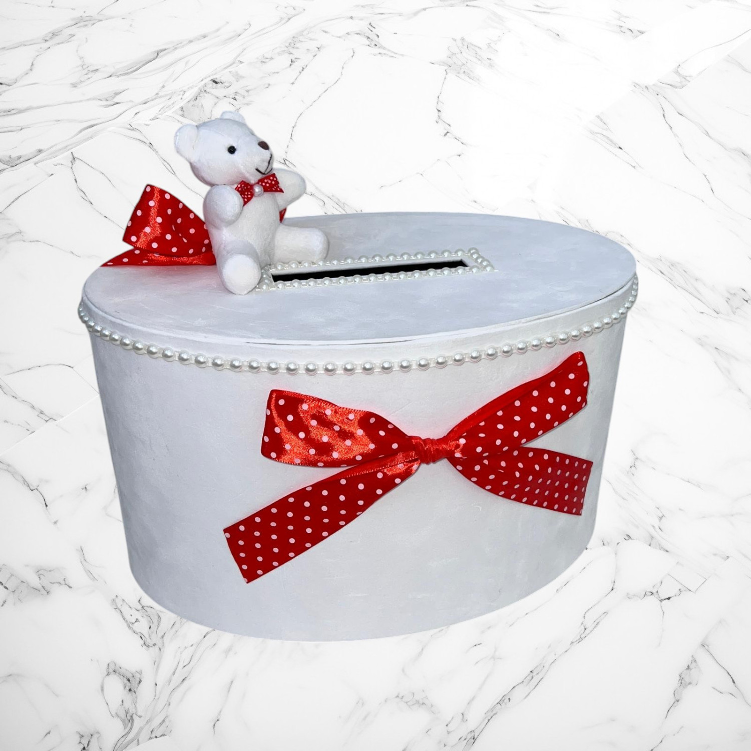 Comanda acum produsul "Cutie de dar cu ursulet, fundite rosii cu buline albe".
