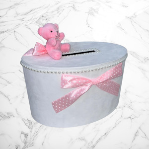 Cutie de dar fetite cu ursulet roz si funde roz cu buline albe