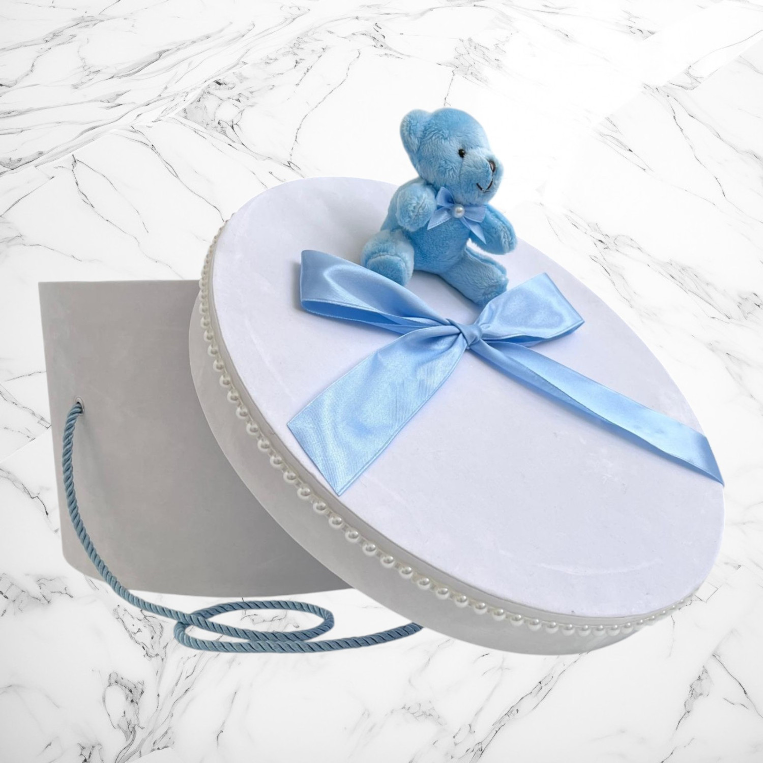 Comanda acum produsul "Cutie trusou botez ursulet plus si funda bleu".