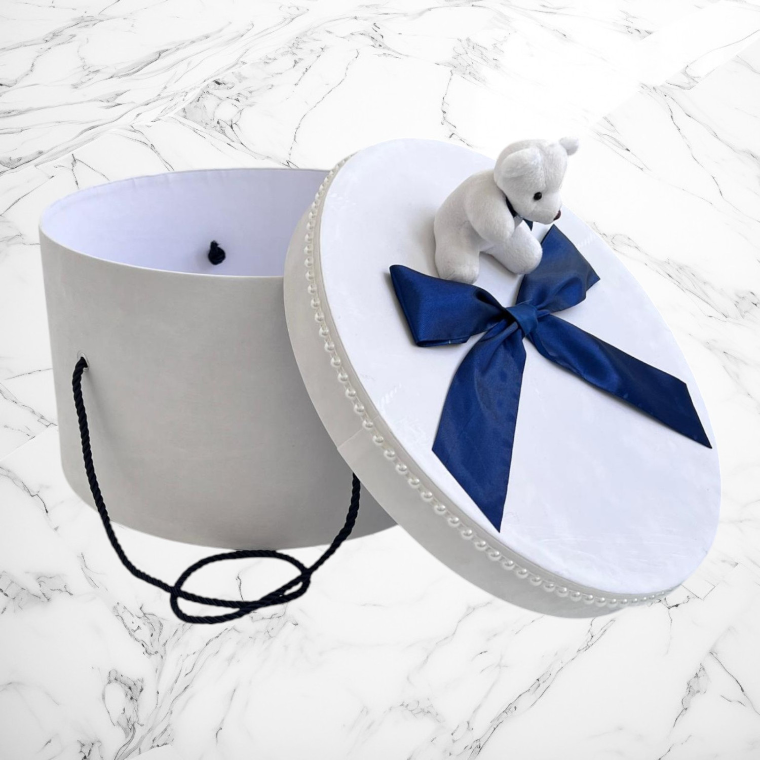 Comanda acum produsul "Cutie trusou botez ursulet plus si funda bleumarin".