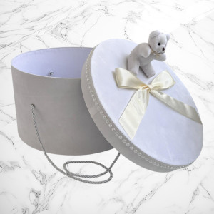 Comanda acum produsul "Cutie trusou botez ursulet si funda ivory".