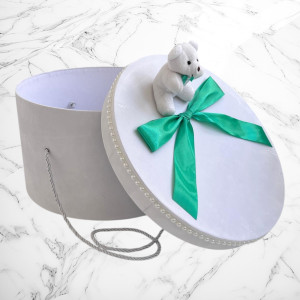 Pentru un botez in note exotice, nasii unui baietel pot alege o cutie trusou botez cu ursulet plus si funda verde menta. Cutia de forma rotunda si este suficient de incapatoare pentru hainele din trusoul bebelusului.