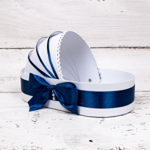 Alege pentru botezul unui baietel o cutie trusou biserica cu decor bleumarin, in forma de landou. Cutia are un design atractiv, este practica si suficient de incapatoare pentru a transporta in ea articolele de trusou.