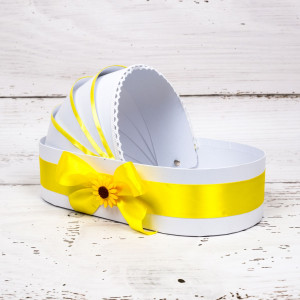 Aceasta cutie tip landou cu decor galben si figurina din fetru floarea-soarelui este ideala atat pentru fetite, cat si pentru baieti. Cutia este eleganta, iar decorul creativ in culori luminoase este realizat in atelierul SelfEvents.ro.