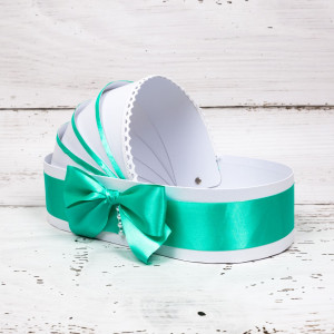 Aceasta cutie din carton cu banda si funda verde din satin este potrivita pentru un baietel. Cutia este decorata manual in atelierul SelfEvents.ro.