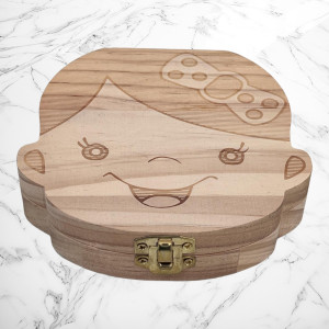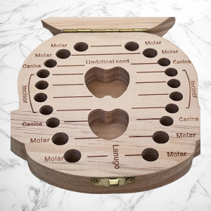 Cutiuta este fabricata din lemn si include spatii speciale pentru a pastra fiecare dintisor de lapte intr-un mod ordonat.