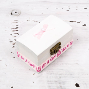 Cutiuta este vopsita si decorata manual cu mare grija pentru detalii in Atelierul SelfEvents.ro. Decorul cu banda si fundita roz cu model It s a girl o face potrivita pentru o fetita.