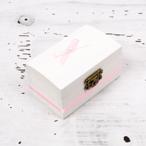 Aceasta cutiuta eleganta pentru mot cu decor roz este accesoriul perfect in care parintii unei fetite pot pastra prima suvita a micutei din primul an de viata. Cutiuta din lemn are forma unui mic cufar si este decorata manual cu grija pentru detalii in Atelierul SelfEvents.ro.