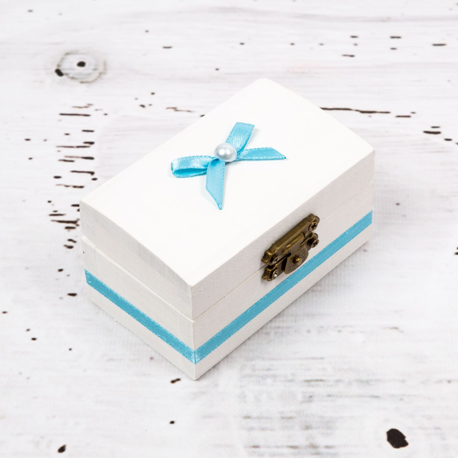 Cutiuta este vopsita cu grund non-toxic si are decor bleu format dintr-o banda bleusi o fundita bleu cu perluta in mijloc.