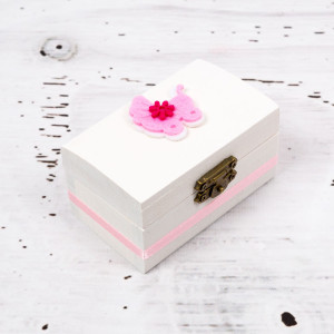 Cutiuta este vopsita cu grund non-toxic si are decor banda roz si o figurina carucior din fetru roz.