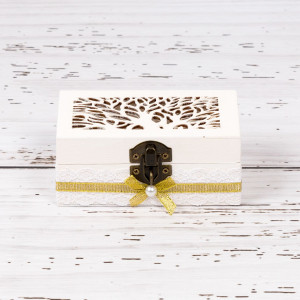 Ulterior, frumosul cufar din lemn cu banda si fundita aurie poate fi transformat intr-o cutiuta de bijuterii.