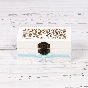 Pentru o nunta de vara in aer liber, pune accent pe detalii si alege un accesoriu amintire, cum este cutiuta verighete nunta cu decor bleu. Cutiuta este decorata manual, iar banda bleu, fundita asortata si perluta ii confera o eleganta discreta.