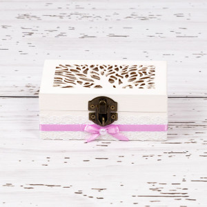 Cutiuta este fabricata din lemn si are forma unui cufar elegant, iar decorul realizat cu grund non-toxic de culoare alba, banda si fundita lila este realizat in atelierul SelfEvents.ro cu deosebita grija pentru detalii.