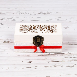 Aceasta este vopsita cu grund alb, non-toxic, banda si fundita rosie. Dupa nunta, in cutiuta pot fi pastrate mici amintiri de la nunta, sub forma de bijuterii sau accesorii.