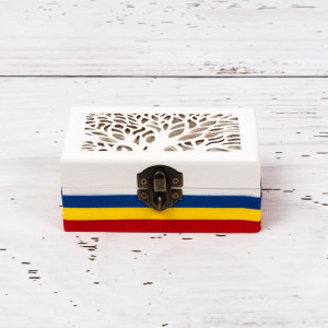 Cutiuta verighete nunta cu decor tricolor este o amintire de durata pentru mirii care si-au legat destinele intr-o zi speciala. Aceasta cutiuta in forma de cufar poate fi folosita in cadrul unei nunti traditionale.
