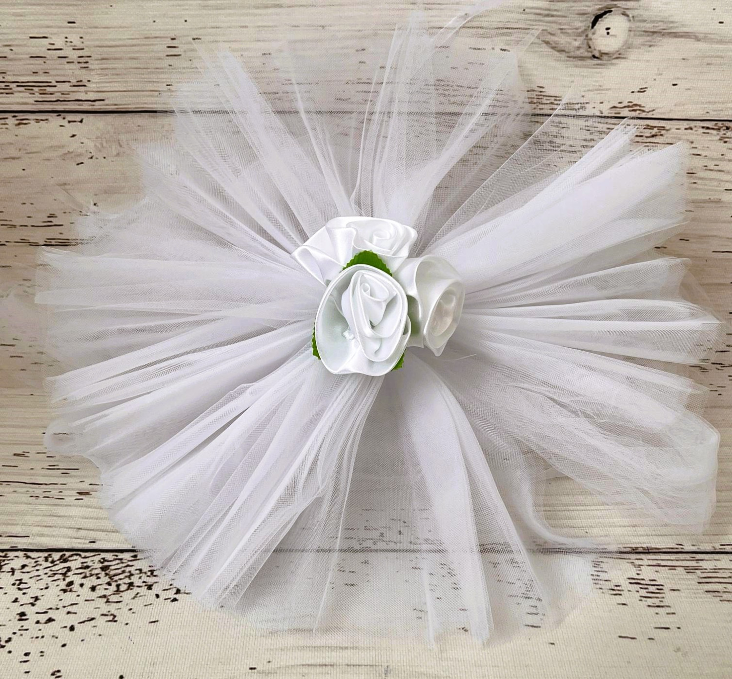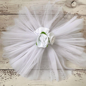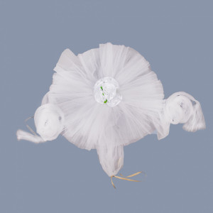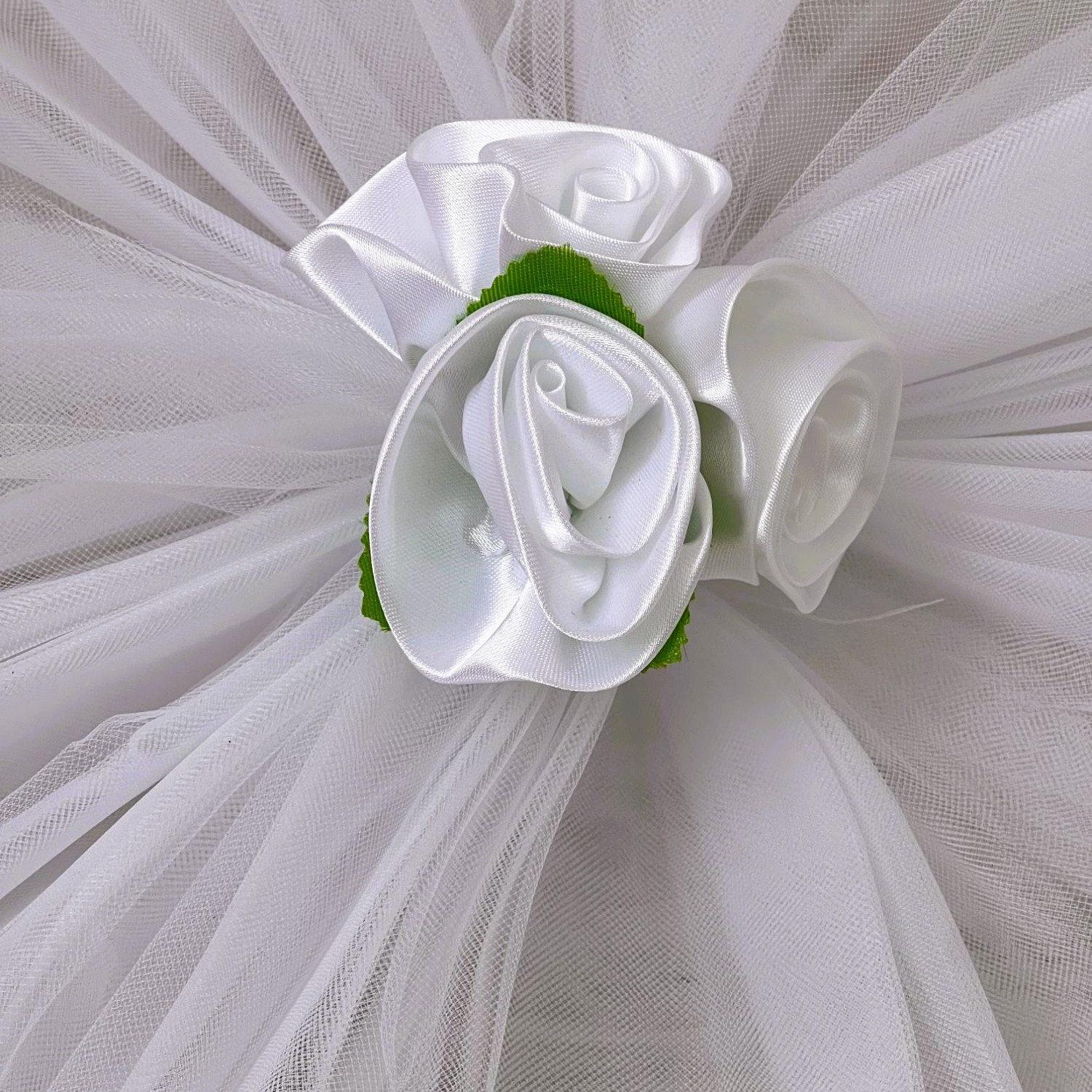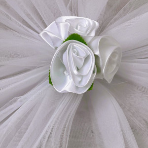 Fiecare brat din tulle care se leaga de oglinzi masoara 190 cm. Acest ornament auto se fixeaza cu ajutorul unor snururi subtiri, cusute de tulle.