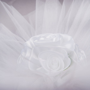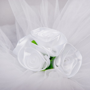 Pentru o nunta in stil traditional, dar si pentru o mireasa conservatoare care poarta rochie alba, masina principalei protagoniste din peisajul nuntii poate fi gatita cu decor din tulle alb si trandafiri albi din satin.