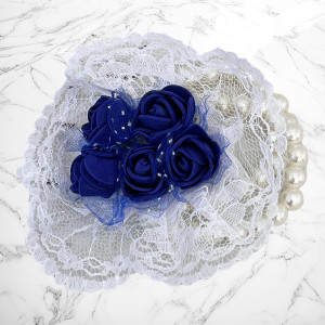 Cele mai frumoase si elegante corsaje pentru domnisoarele de onoare sunt bratarile cu margele si buchet de flori format din cinci trandafiri albastrii, imprejmuiti de dantela.