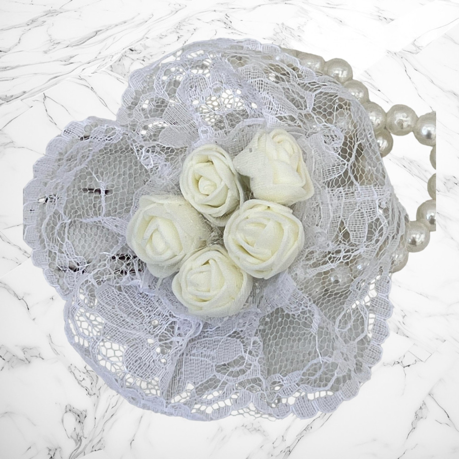Materiale: dantela, margele tip perla, trandafiri spuma.