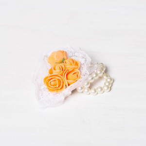 Acest accesoriu nunta este realizat manual si are baza elastica pe care sunt insirate mai multe margele rotunde. In mijloc sunt asezati cinci trandafiri portocalii.