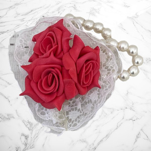 Cele mai frumoase si elegante corsaje pentru domnisoarele de onoare sunt bratarile cu margele si buchet de flori format din cinci trandafiri rosii.