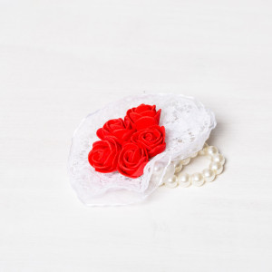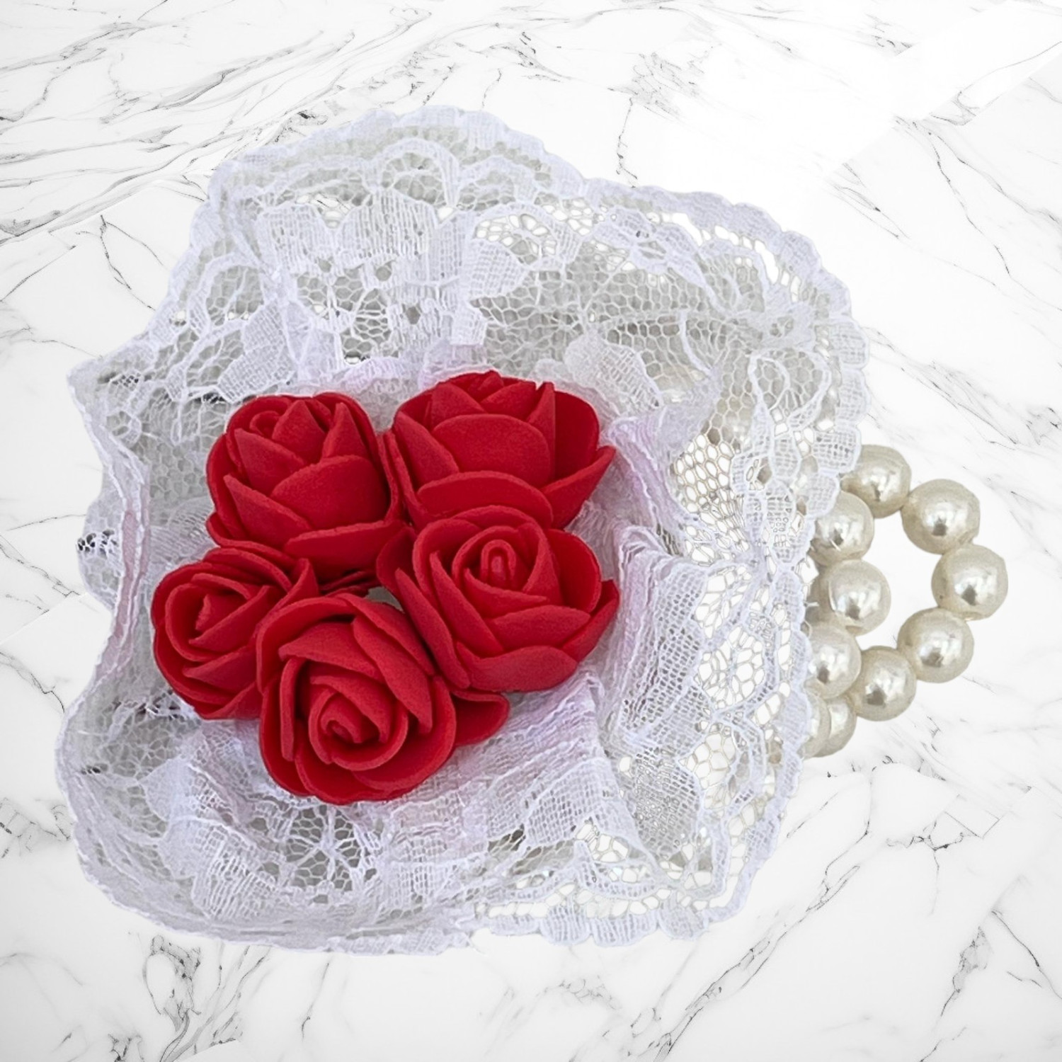 Domnisoarele de onoare care poarta rochii viu colorate vor fi incantate sa poarte la mana o bratara cu cinci trandafiri rosii, imprejmuiti de dantela.