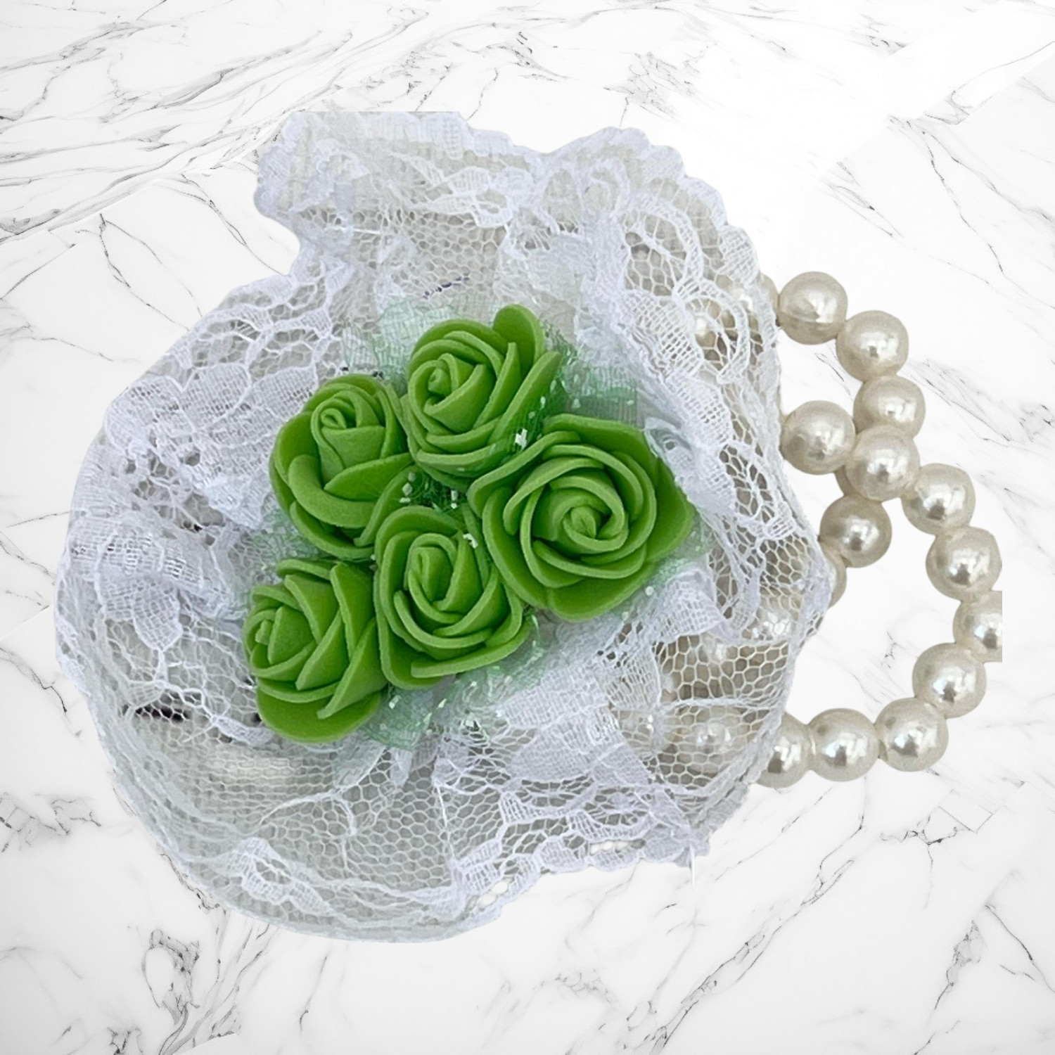 Materiale: dantela, margele tip perla, trandafiri spuma.