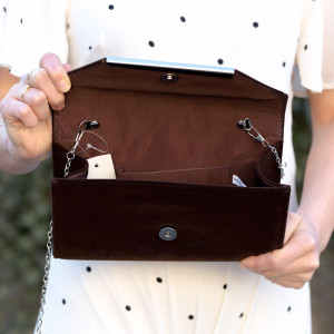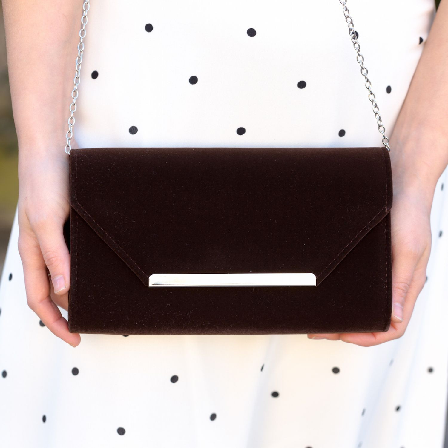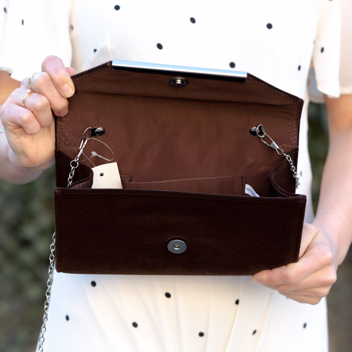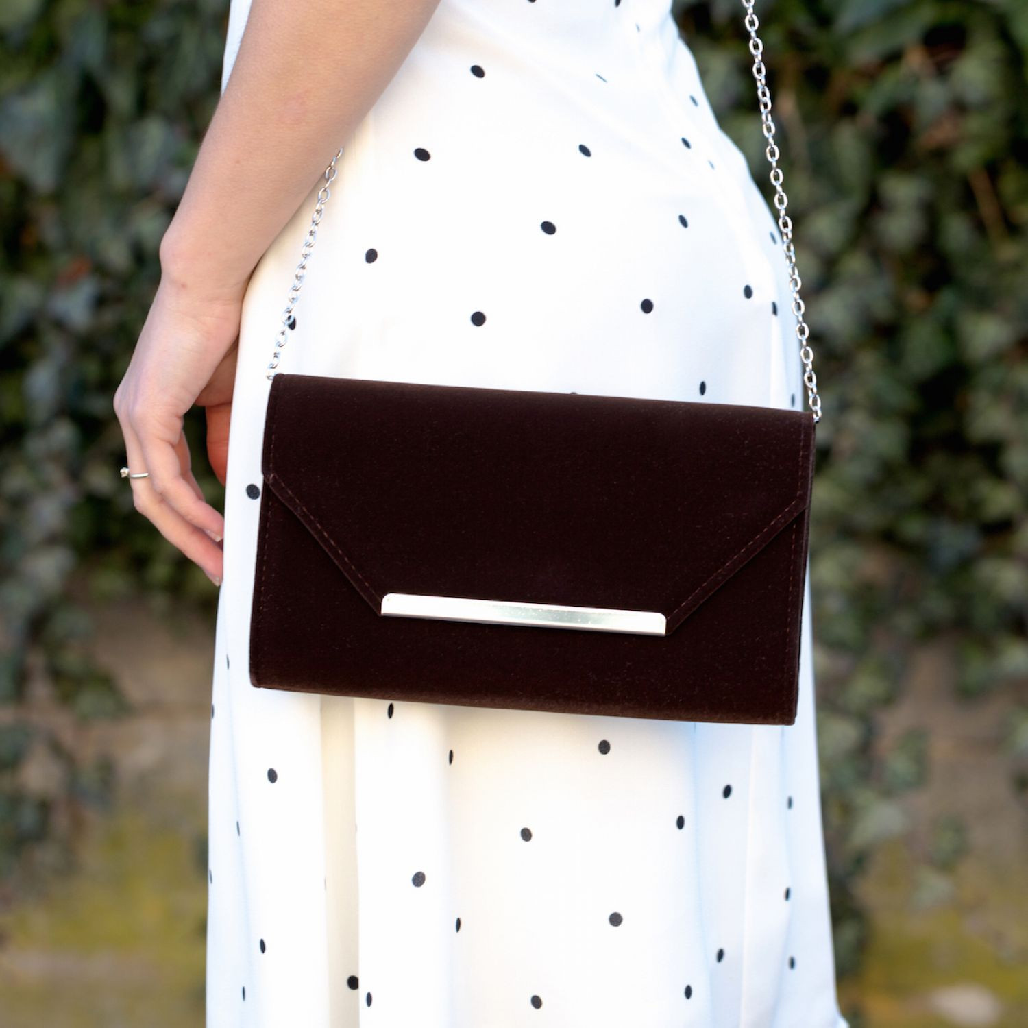 Poseta maro din catifea are lant detasabil, astfel incat o poti purta pe umar sau in mana.