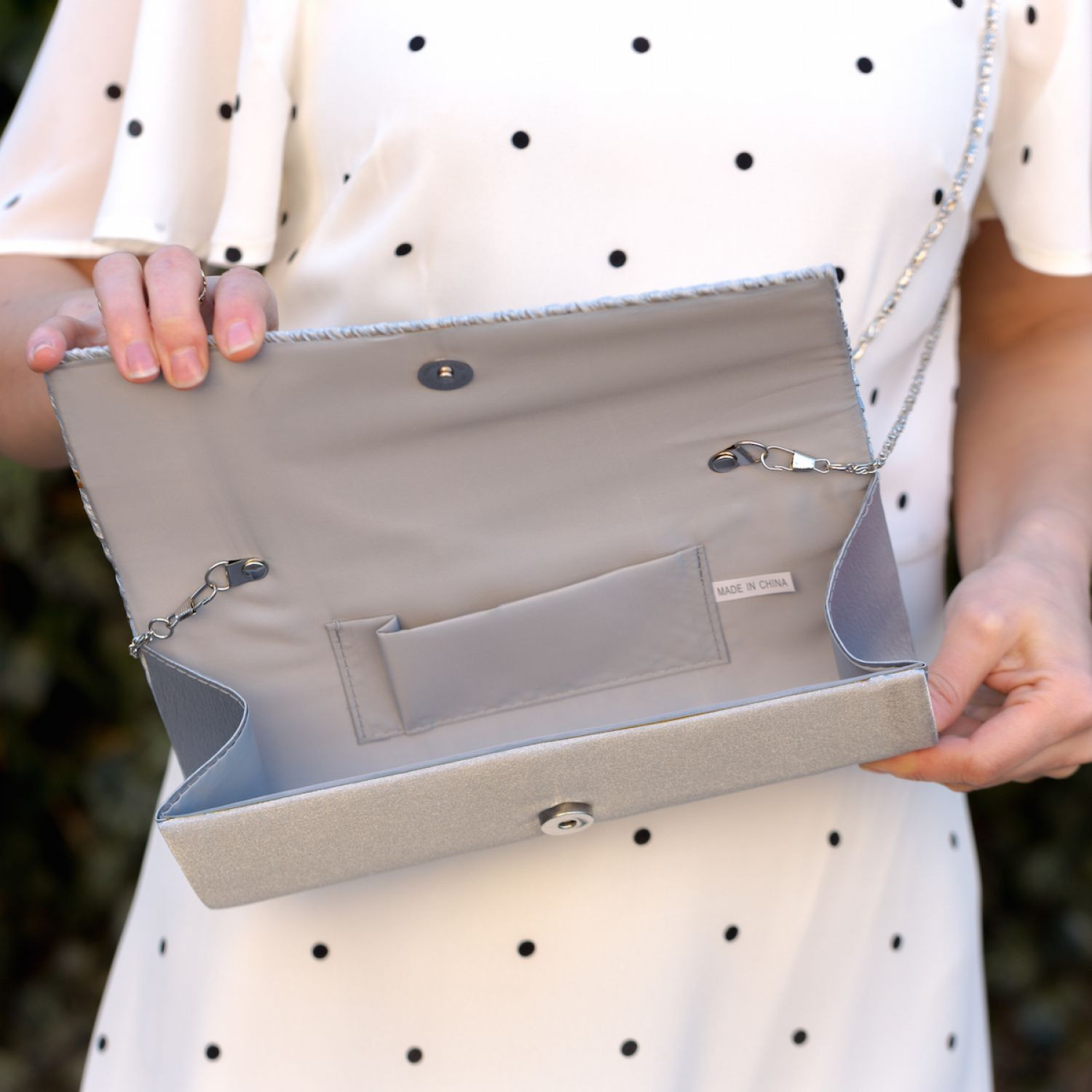 Plicul de ocazie gri din satin cu model este un accesoriu clasic, care lasa o impresie pozitiva oriunde te afisezi cu ea.