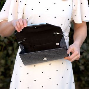 Plicul de ocazie negru cu irizatii stralucitoare este un accesoriu modern, nelipsit din arsenalul unei femei.