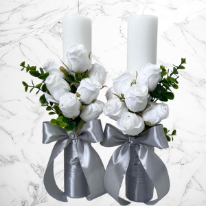 Aceste lumanari sunt decorte cu trandafiri artificiali albi si fundita argintie.