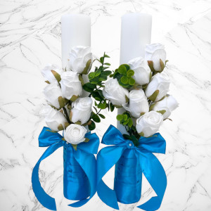 Aceste lumanari sunt decorte cu trandafiri artificiali albi si fundita turcoaz.