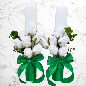 Aceste lumanari sunt decorte cu trandafiri artificiali albi si fundita verde.