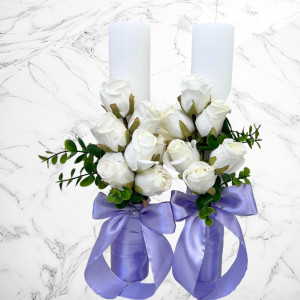 Aceste lumanari sunt decorte cu trandafiri artificiali ivory si fundita lila.