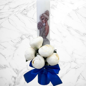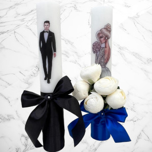 Aceste lumanari sunt decorte cu bujori artificiali albi si fundita albastra si neagra.